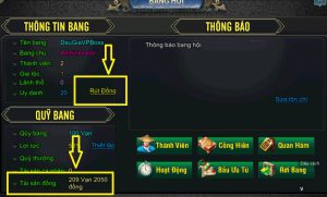 + Chỉ Bang chủ lại npc rút ra kim nguyên bảo ( trừ thuế 10% ) 1 KNB = 100 đồng thường